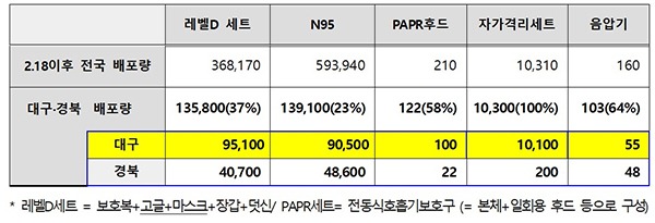 특히 지난 달 18일 31번 확진자 발생일 이후에는 대구·경북 지역에 레벨D세트 14만개와 방역용 마스크(N95) 14만개, 이동형 음압기 103개, 체온계와 수술용마스크·손소독제로 구성된 ‘자가격리 위생키트’ 1만여개 등을 우선 지원했다.