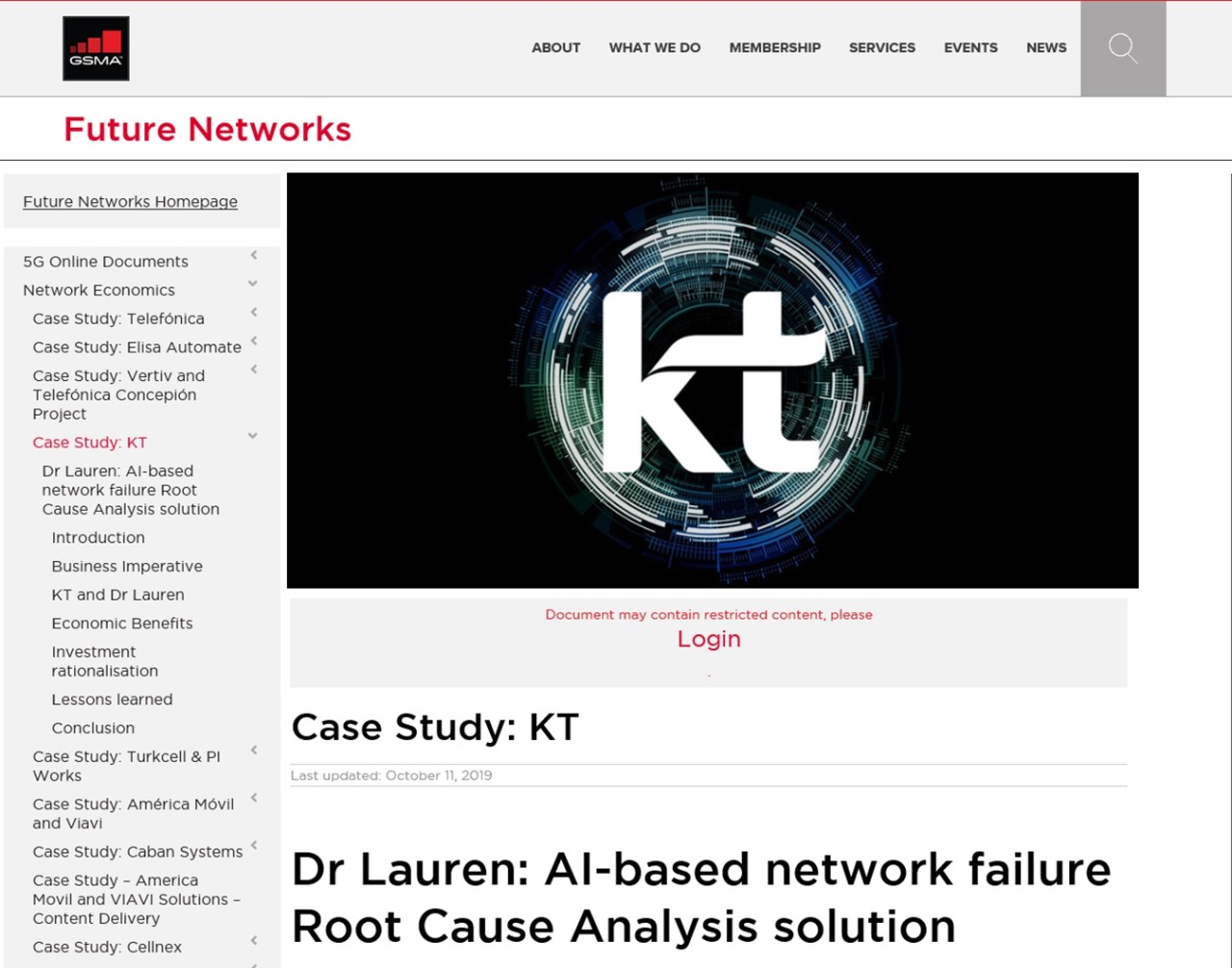 KT(www.kt.com)는 자체 개발한 인공지능 기반 통신 장애 분석 솔루션 ‘닥터 로렌(Dr. Lauren)’이 ‘세계이동통신사업자연합회(Global System for Mobile communications Association, GSMA)’의 ‘사례 연구(Case Study)’로 선정돼 그 동안 연구 결과가 세계이동통신사업자연합회 홈페이지에 공개됐다고 3일 밝혔다.
