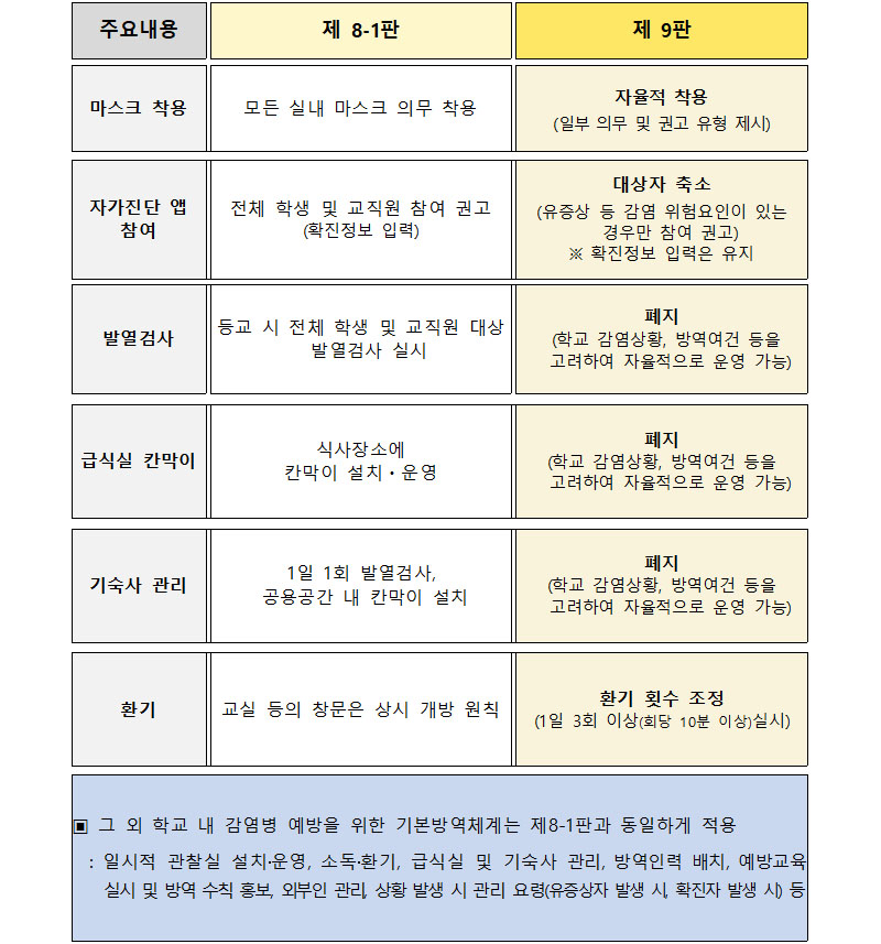 이에 따라 자가진단 앱 등록은 유증상자 위주로 실시되고 등교 시 발열검사와 급식실 칸막이가 폐지되는 한편, 개학 후 약 2주간 ‘학교 특별 방역 지원기간’을 운영한다.