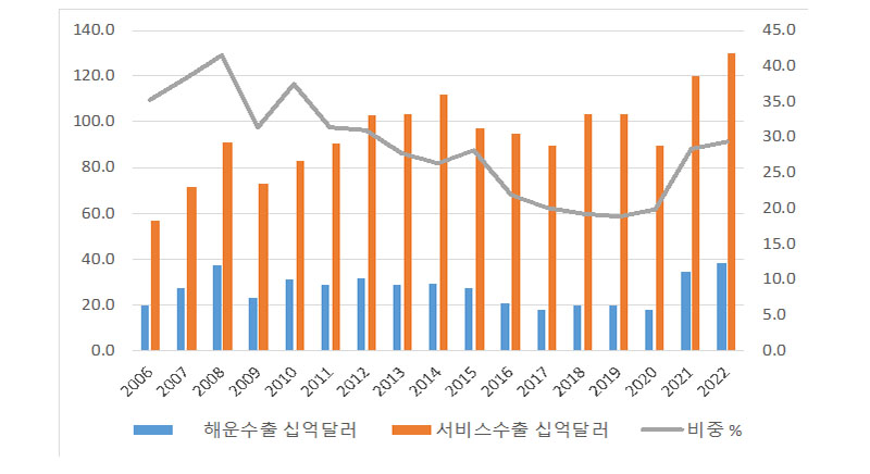 해운산업은 서비스산업 전체 수출액(1382억 달러)의 29.4%를 차지해 2021년에 이어 지난해에도 서비스 분야 수출 1위를 달성했다. 상품 수출과의 단순 비교는 어려우나 지난해 해운 수출액 383억 달러는 수출 6위 품목인 철강 수출과 버금가는 실적이라고 해수부는 설명했다.