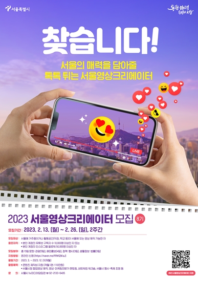 서울시는 각 분야에서 활동하고 있는 영상창작가를 대상으로 ‘제8기 서울영상크리에이터’를 ’23년 2월 13일부터 2월 26일까지 모집한다.