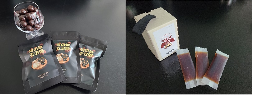 개발된 흑마늘 초콜릿볼은 초콜릿과 흑마늘을 결합하여 기능성 및 젊은 층의 기호도를 높인 건강 간식으로, 흑마늘 즙을 활용하여 제조했으며 흑마늘을 첨가함에 따라 총 폴리페놀 함량 및 항산화 활성이 1.5배 증가했다.
