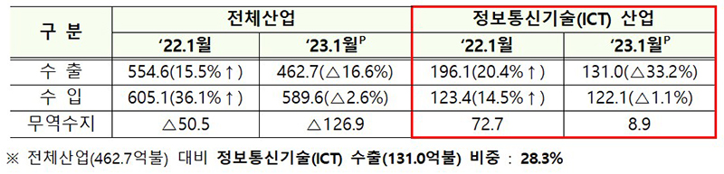 과학기술정보통신부는 11일 ‘2023년 1월 ICT 수출 및 수입’ 현황을 발표, 수출은 7개월 연속 감소했고 수입 또한 전년 동월 대비 1.1% 감소했다고 밝혔다.