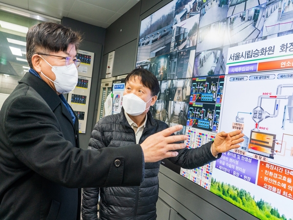 한국영(사진 왼쪽) 서울시설공단 이사장이 경기도 고양시 서울시립승화원에서 화장시설과 안치시설 가동상황을 점검하고 있다.