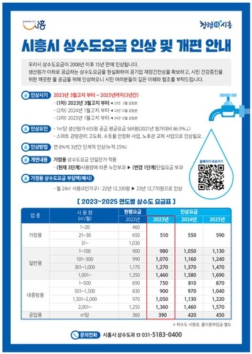 또한, 가정용 상수도는 누진요금제가 폐지돼 단일화된다. 시흥시 가정용의 경우 96%의 사용자가 누진 1단계(1~20톤) 구간에 집중돼 절수효과 및 소득 재분배 효과가 미미해짐에 따라 폐지가 결정됐다.