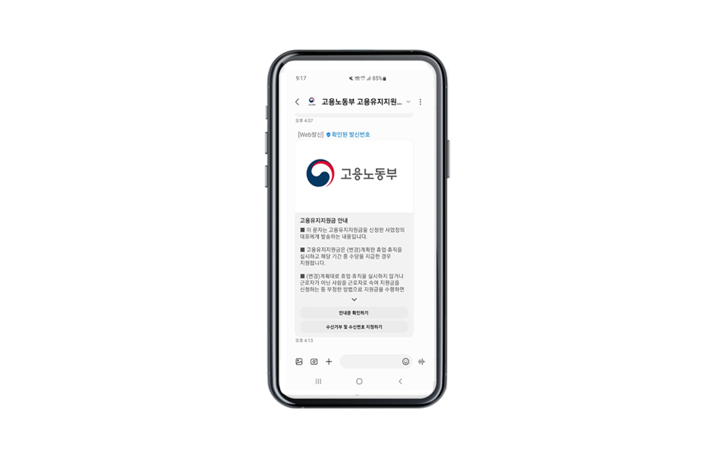 현재 고용노동부는 정부 기관 최초로 고용유지지원금 안내문이 담긴 공인알림문자를 안심마크가 포함된 RCS 방식으로 근로자와 사업주에게 시범 발송하고 있다.
