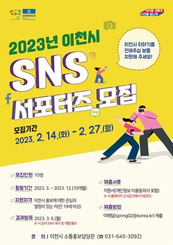 SNS 서포터즈는 이천시의 다양한 이야기와 관광 명소 등을 취재해 시정홍보 사항 및 시민에게 유용한 소식을 발굴하고, SNS로 전파하는 역할을 한다.