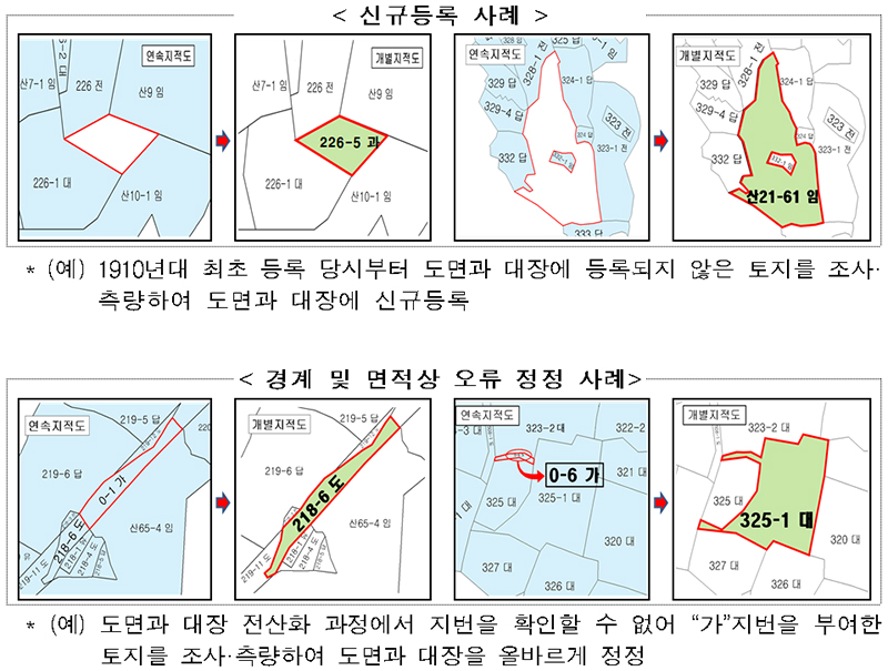 또 도면과 대장에 등록은 됐으나 경계나 면적에 오류가 있는 경우는 정정해, 지적공부 등록면적이 0.7㎢ 늘었다.