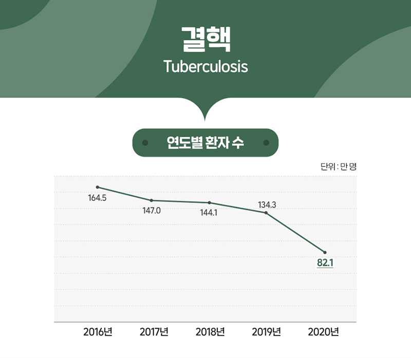 ‘결핵’은 ‘결핵균’이 침입하여 발생하는 병입니다. ‘결핵’은 호흡기 분비물로 옮겨지는 전염성 질환으로, 환자와 접촉하는 가족 중에서 발생하는 경우가 많습니다. 누구든지 ‘결핵’에 걸릴 가능성이 있으나 ‘결핵균’이 침입한다고 해서 모두 다 발병하는 것은 아닙니다. ‘결핵균’이 침입한 후 체내의 저항력이 약해지면 발병할 확률이 높아집니다.