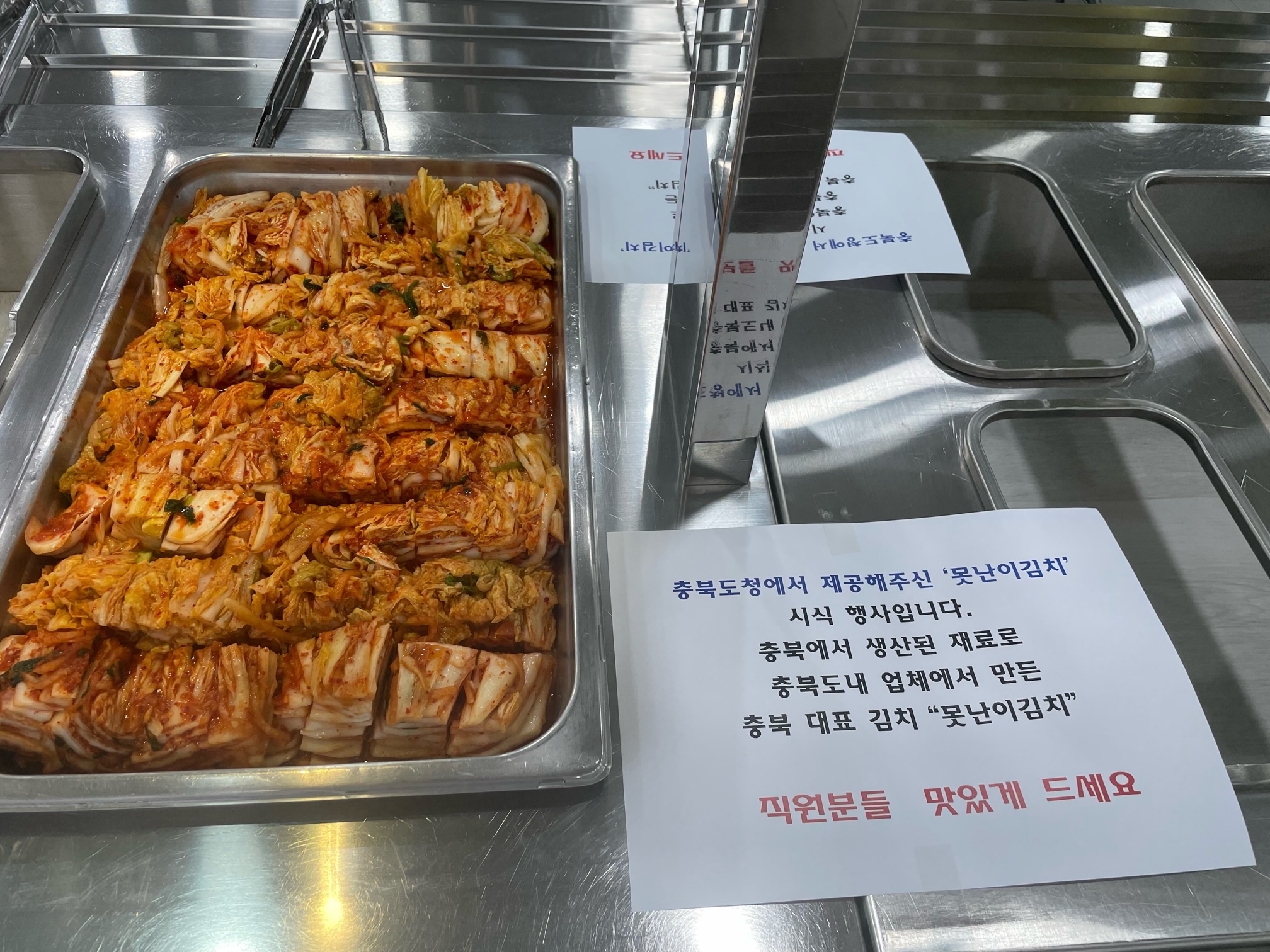 사진 확대보기 충북의 못난이 김치 300kg(시도별 100kg)이 충청권 3개 시도(대전, 세종, 충남) 직원들의 밥상에 올라 큰 호평을 얻었다.