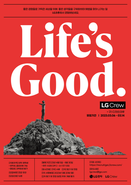 LG전자가 내달 6일부터 14일까지 LG크루로 활동할 Z세대 대학생 16명을 모집한다. 호기심이 많고, 자신의 이야기를 널리 알리고 싶은 대학생이라면 전공에 상관없이 지원할 수 있다. 활동 기간은 오는 4월부터 8월까지다.