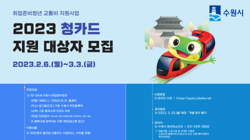 경기 수원시가 '2023년 취업준비청년 교통비 지원사업(청카드 사업)' 지원 대상자 400여 명을 내달 3일까지 모집한다.