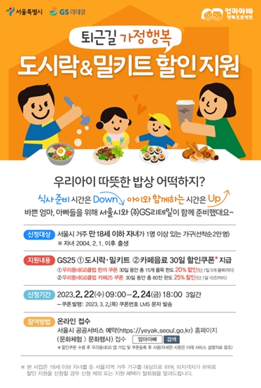 서울시 ‘퇴근길 가정행복 도시락・밀키트 할인지원’ 사업’은'엄마아빠 행복프로젝트'의 하나로, 엄마아빠가 퇴근 후 아이와 더 많은 시간을 보내도록 도시락, 밀키트 등을 20% 할인된 가격에 살 수 있게 지원하는 사업이다. 작년 10월 ㈜GS리테일과 함께 사업 개시 이후 이틀 만에 신청 마감한 바 있다.