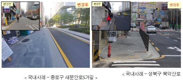 예컨대, 유동인구가 많은 지하철역과 아파트 단지 인근의 도로지만 평소 좁은 보행로로 불편했던 ‘구로구 구일로10길’은 4차로를 2차로로 축소하고 보행로를 6~8m→8~15m로 확장했다. 좁은 이면도로를 주차차량이 가로막고 있던 ‘종로구 율곡로4길’은 주차면을 없애고 보도를 신설했다.