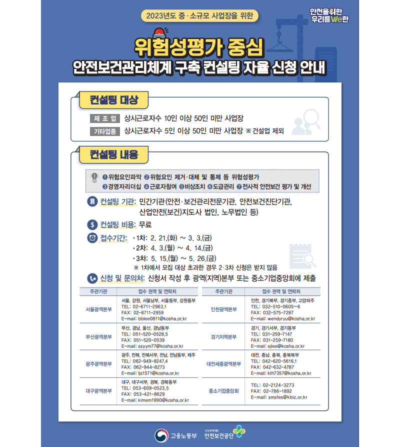 컨설팅 신청 기간은 21일부터 다음달 3일까지며 한국산업안전보건공단 광역본부와 중소기업중앙회에 방문·우편·팩스·전자우편으로 신청할 수 있다.