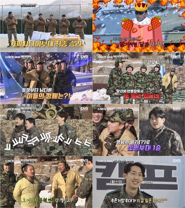ENA ‘신병캠프’에서 만난 레전드 군대 드라마 '푸른거탑' 팀과 '신병'팀이 확실한 '짬밥 차이'를 토대로 탐색전만으로도 배꼽 잡는 재미를 선사했다.