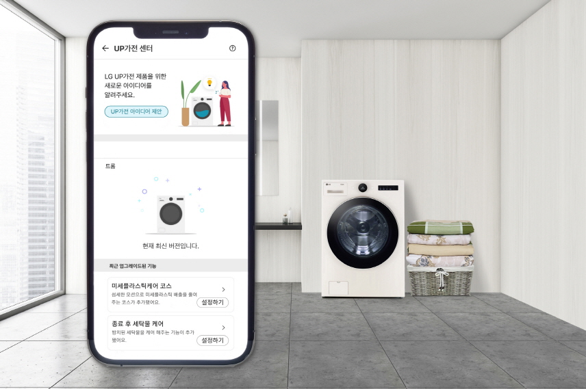 LG전자는 작년 1월 UP가전 선포 후 ‘종료 후 세탁물 케어’, ‘펫케어’ 등 세탁기를 포함 24종의 UP가전을 출시했고 150개 이상의 업그레이드 콘텐츠를 배포했다. 고객이 LG 씽큐 앱 내 ‘UP가전 아이디어 제안’과 각종 이벤트를 통해 제안한 업그레이드 아이디어는 6천 건이 넘는다. LG전자가 UP가전 선포 후 배포한 업그레이드 콘텐츠 중 고객이 제안한 아이디어를 기반으로 개발한 것은 절반 이상이다.