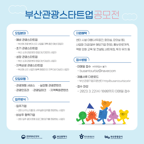 부산광역시와 부산관광공사는 부산 관광산업 경쟁력을 강화하고 창의적인 관광산업 발굴과 관광 분야 창업 확산을 도모하고자 '2023년 부산관광스타트업 공모전'을 개최한다.