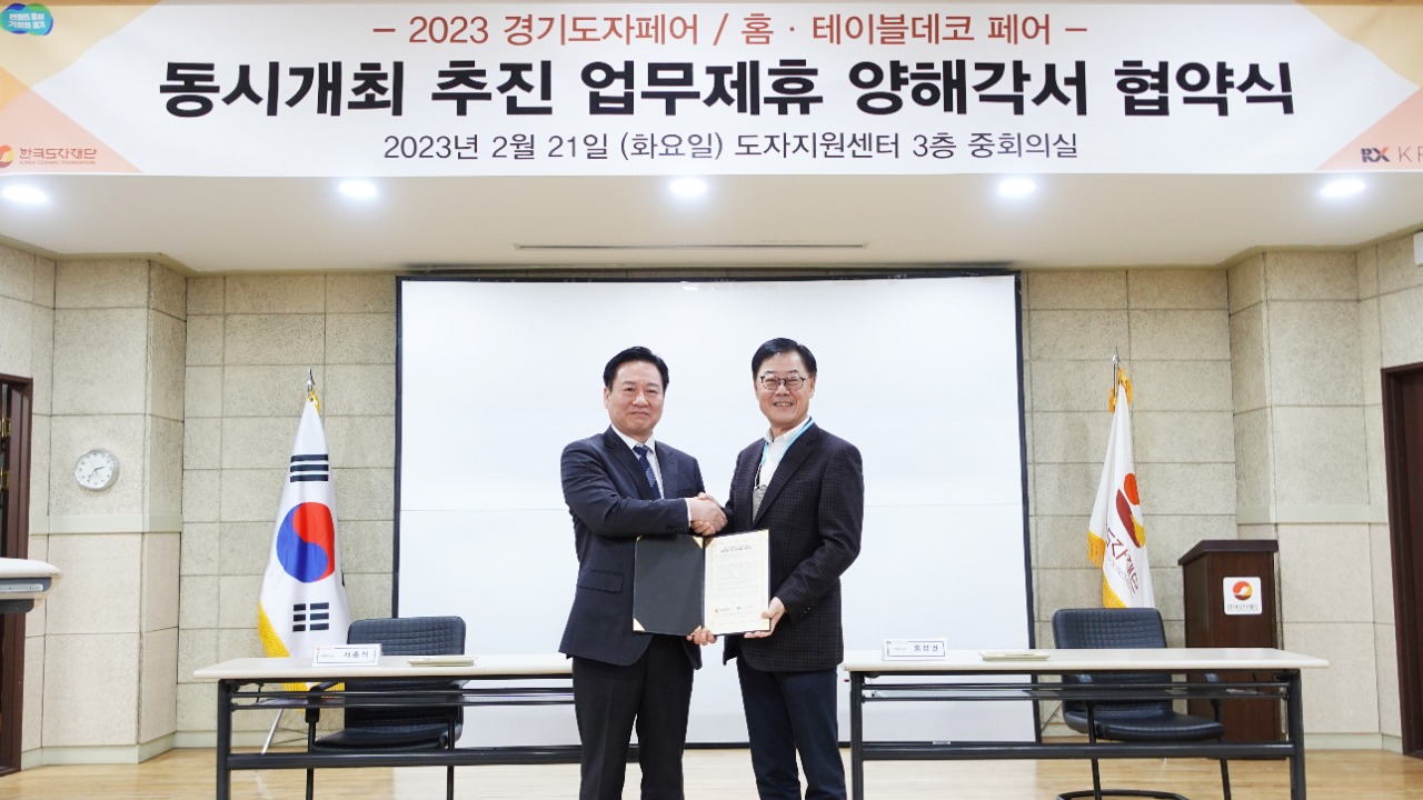 한국도자재단과 전시 전문 기업 리드케이훼어스 유한회사는 21일 한국도자재단 이천 도자지원센터에서 ‘2023 경기도자페어와 홈·테이블데코페어의 성공적인 동시 개최’를 위한 업무협약을 체결했다.