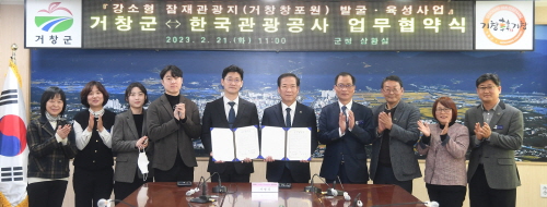 경남 거창군은 21일 군청 상황실에서 구인모 군수와 이국희 한국관광공사 경남지사장 등 8명이 참석한 가운데 한국관광공사 경남지사와 강소형 잠재관광지 발굴·육성을 위한 업무협약을 체결했다.
