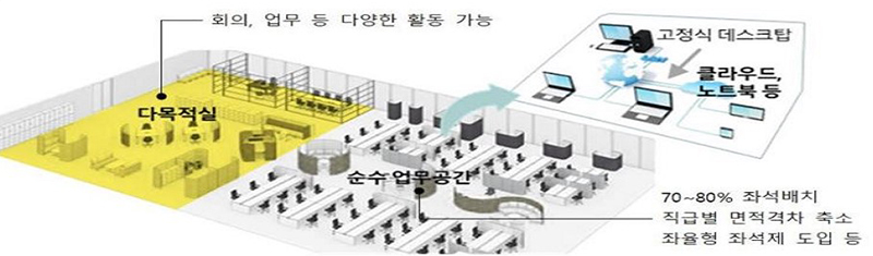 특히 업무공간 활용 시범사업은 재택근무, 출장, 연가 등으로 인한 업무공간의 공석률을 고려해 좌석 수를 직원 수의 70~80%만 배치하고 이로 인해 확보된 여유공간은 다목적실로 조성하는 것이 특징이다.