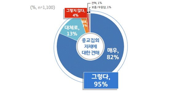 그 결과 종교집회를 ‘자제해야 하느냐’는 물음에 95%의 응답자가 동의했다. 종교집회 자제 찬성 응답은 개신교인(92%), 불교인(98%), 천주교인(98%), 무종교인(95%) 등 종교 여부에 관계없이 높게 나타났다.