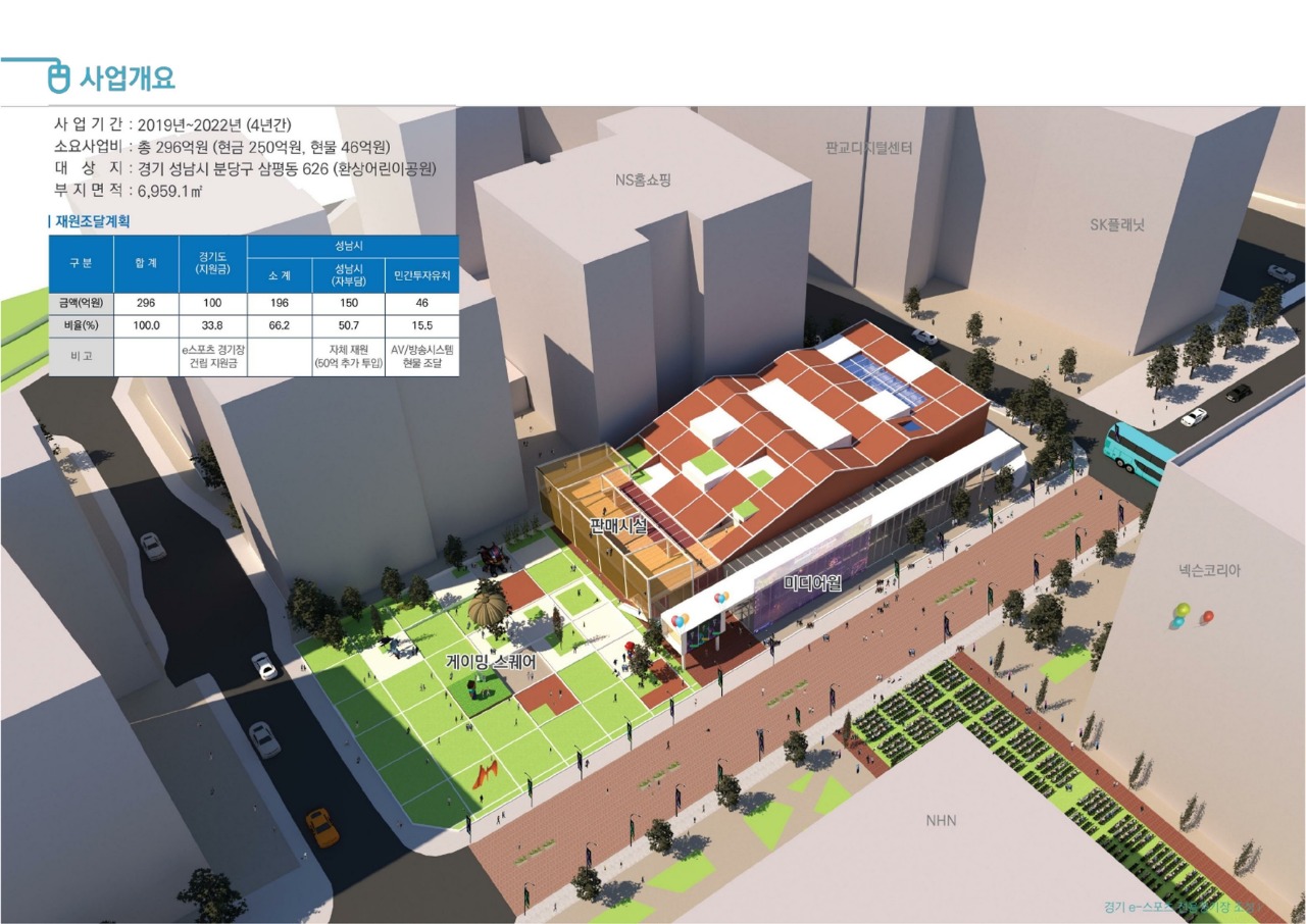 시는 296억원(도비 100억원 포함)의 사업비를 투입해 시유지인 분당구 삼평동 626번지 판교1테크노밸리 공원 부지에 e-스포츠 전용경기장을 건립한다.