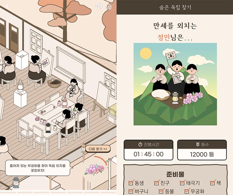 게임은 이 같은 만세운동 이야기를 ‘숨은그림찾기’ 형식으로 담아냈다. 참여자가 배화학당을 배경으로 숨겨져 있는 태극기와 독립선언서 등의 독립운동 소재(아이템)를 찾아 만세운동에 참여하는 임무를 수행하도록 구성됐다.