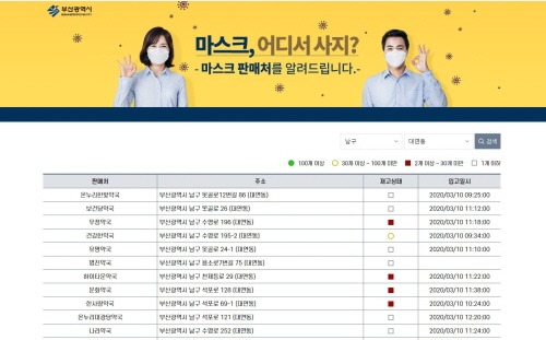 부산광역시는 공적 마스크 판매현황을 실시간으로 알려주는 '부산시 공적 마스크 재고 알림(http://www.busan.go.kr/maskinfo)' 서비스를 11일 오후 3시부터 오픈한다고 밝혔다.