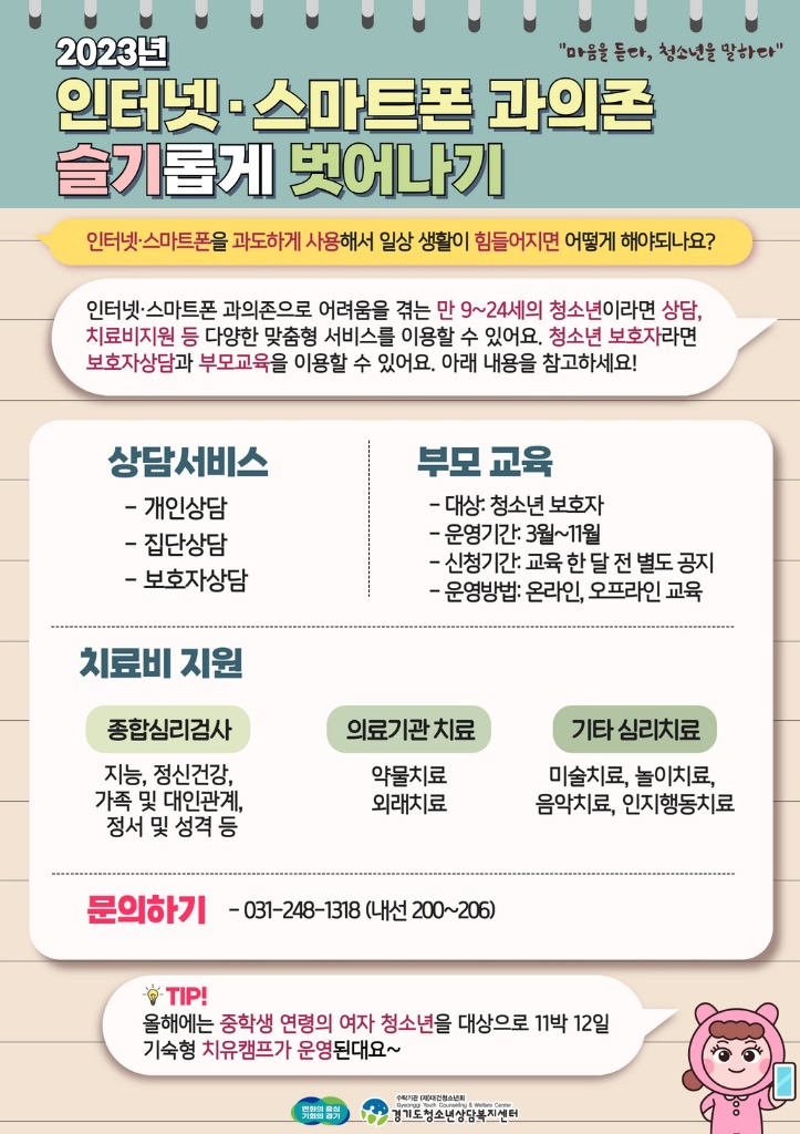 경기도가 경기도청소년상담복지센터와 함께 9세~24세의 인터넷‧스마트폰 과의존 청소년과 보호자를 대상으로 상담, 치료비 지원, 부모교육 등 다양한 맞춤형 서비스를 제공한다고 27일 밝혔다.