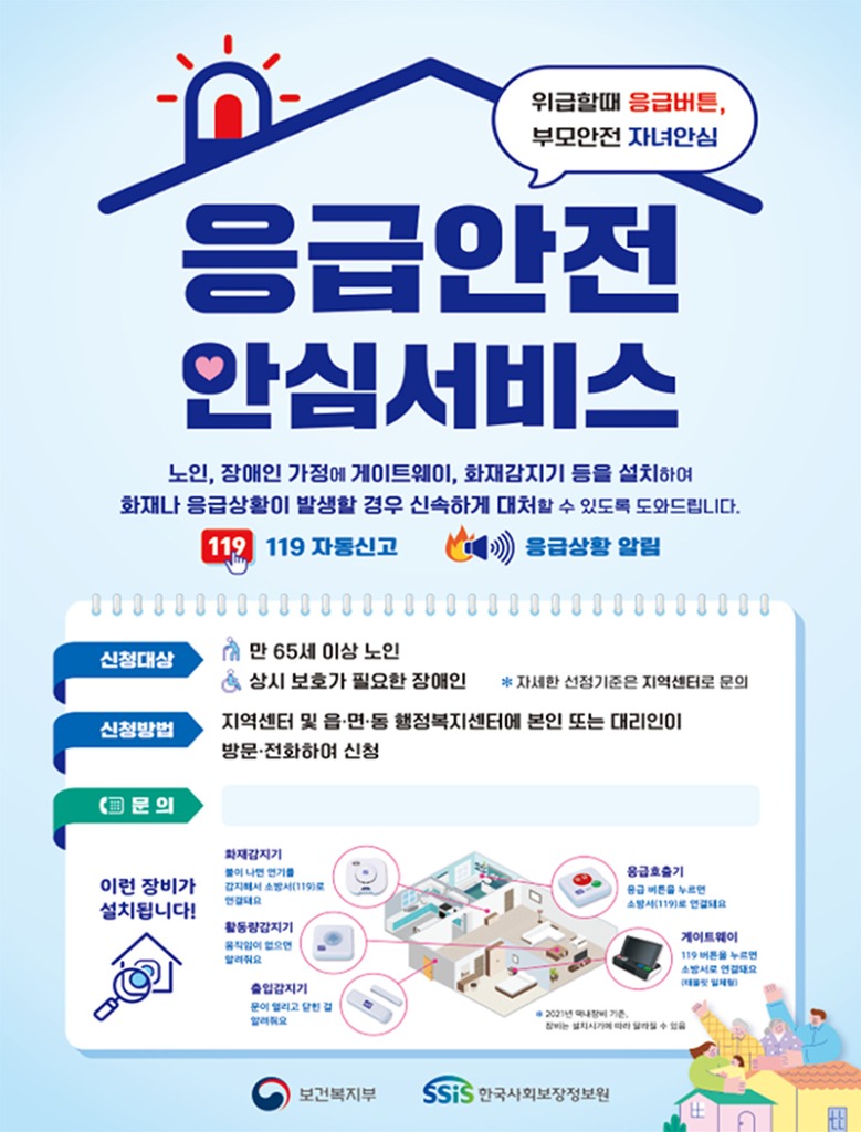 독거노인·장애인 응급안전안심서비스는 보건복지부 주관 사업으로 독거노인과 장애인 가정에 정보통신기술(ICT) 기반의 장비를 설치해 화재, 낙상 등의 응급상황 발생 시 119에 신속한 연결을 도와 구급·구조를 지원하는 사업이다.