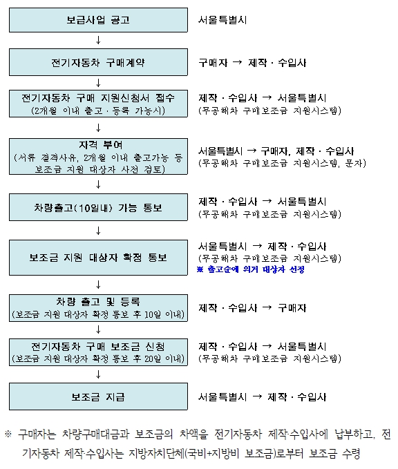 보조금 지급대상 선정방식은 지난해와 마찬가지로 차량 출고․등록순이며, 보조금은 서울시가 자동차 제작·수입사로 직접 지급해 구매자는 자동차 구매대금 중 보조금을 제외한 나머지 금액만 제작·수입사에 납부하면 된다.