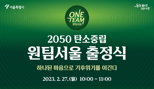 서울시는 2월 27일(월) 9시 50분 서울시청 8층 다목적홀에서 25개 자치구, 서울시의회, 서울시 및 자치구 탄소중립녹색성장위원회, 시민 등 300여 명과 함께 기후위기 대응과 탄소중립 달성을 위한 ‘원팀’ 출정식을 개최한다고 밝혔다.