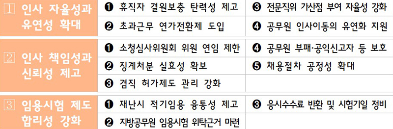 이번 계획은 ▲인사 자율성과 유연성 확대(4개 추진과제) ▲인사 책임성과 신뢰성 제고(5개 추진과제) ▲임용시험 제도 합리성 강화(3개 추진과제) 등 3대 추진전략의 12개 세부추진과제로 구성됐다.