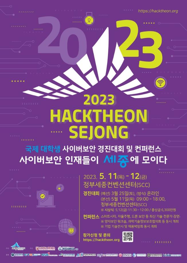 세봉시는 오는 5월 11일부터 12일까지 정부세종컨벤션센터(SCC)에서 ‘2023 핵테온 세종(2023 HackTheon Sejong) 국제 대학생 사이버보안 경진대회 및 컨퍼런스’를 개최한다.