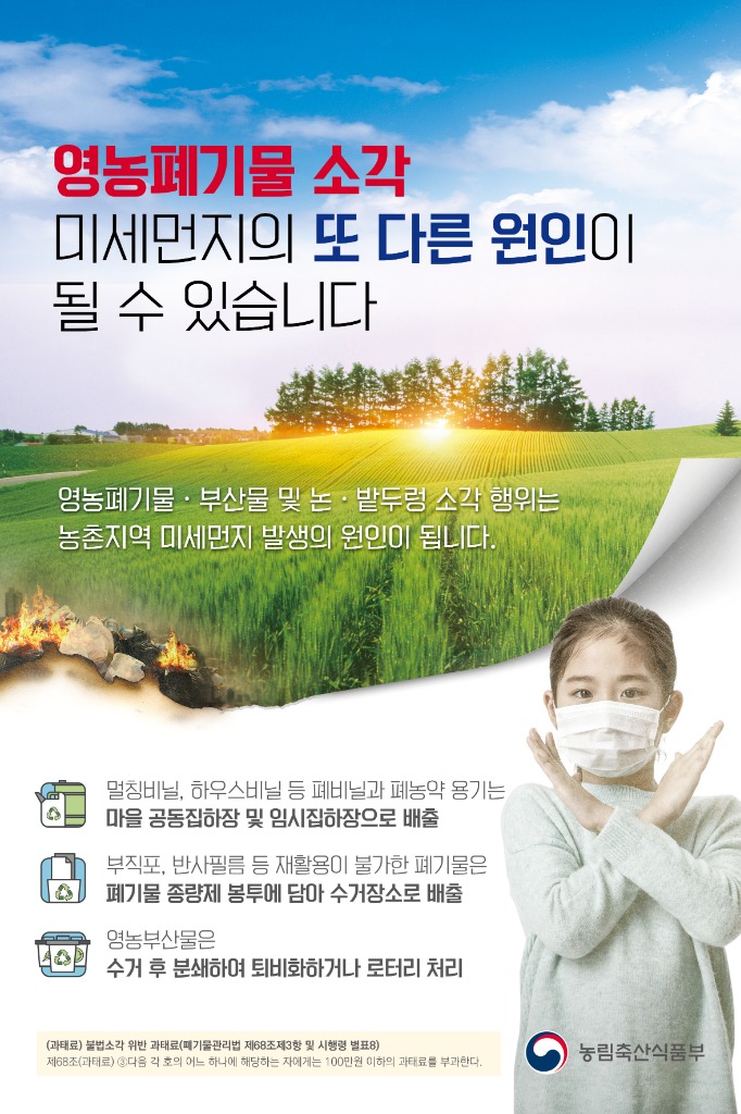 도 관계자는 “봄철 관행적인 농촌 불법소각을 방지하여 깨끗한 대기 환경 유지와 산불 예방으로 이어지도록 도민들의 적극적인 관심과 참여를 바란다”며 “경기도에서도 깨끗한 농촌 환경을 위해 지속적으로 노력하겠다”고 말했다.