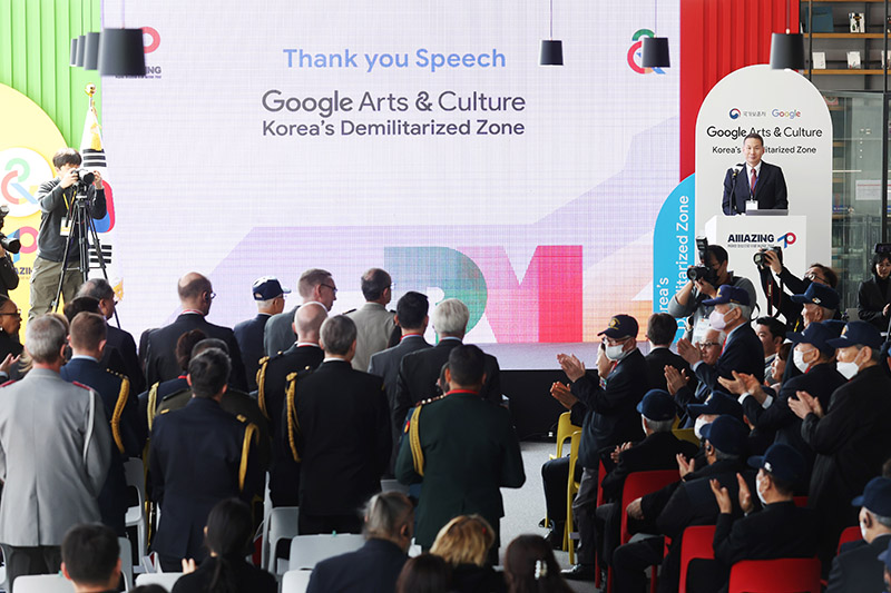 박 처장은 헌정식 축사에서 “전쟁의 참화를 극복하고 선진국으로 우뚝 선 대한민국의 놀라운 70년, 성공의 역사를 전세계에 알리고 우리 국민들과 22개 참전국이 함께 자부심을 가질 수 있도록 다양한 기념사업을 마련했다”며 “구글 DMZ 아카이브를 통해 전 세계 많은 분들이 6·25전쟁의 역사 그리고 DMZ 내 자연을 체험하면서 올해 70주년의 의미와 참전영웅들의 숭고한 인류애를 뜨겁게 되새기는 소중한 계기가 되길 바란다”고 전했다.