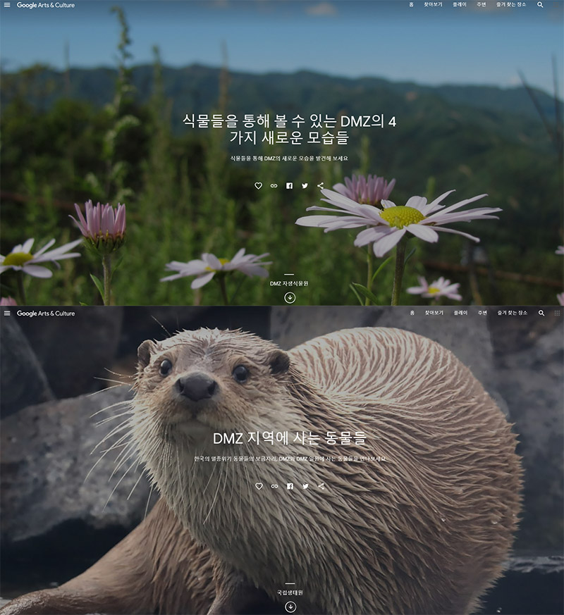 ‘자연’ 컬렉션에서는 방문이 제한적인 DMZ 지역을 누구나 쉽게 경험할 수 있도록 ‘스트리트 뷰’ 기술이 적용됐다. 구글은 수십억 개의 파노라마 이미지를 결합해 가상으로 표현하는 스트리트 뷰 기술로 대한민국 람사르 습지 1호 용늪, 6·25전쟁 격전지이자 독특한 해안분지 지형으로 알려진 펀치볼, 세계적인 두루미 도래지인 한탄강 등을 직접 걸어보는 것처럼 경험할 수 있게 했다.