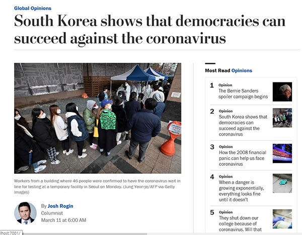 미국 일간지 워싱턴포스트(WP)는 11일(현지시간) 코로나19를 둘러싼 글로벌 대응책을 다룬 논평 ‘코로나19에 맞서 민주주의가 성공할 수 있음을 보여준 한국(South Korea shows that democracies can succeed against the coronavirus)’에서 이 같은 견해를 밝혔다.