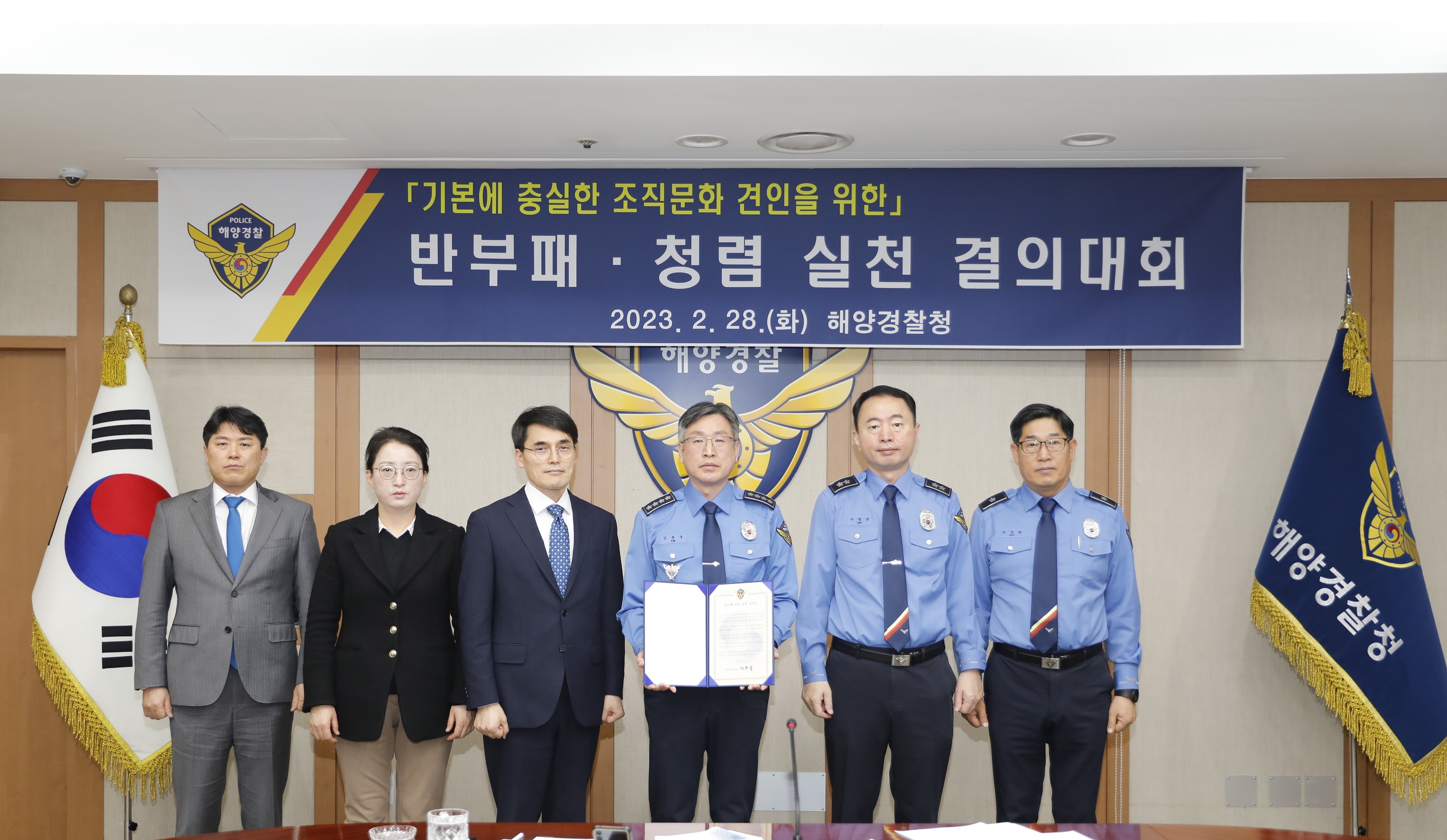 해양경찰청은 전국 지휘관을 중심으로 청렴한 조직문화 조성을 위해‘반부패・청렴 실천 결의대회’를 2023. 2. 28. 개최하였다고 밝혔다.