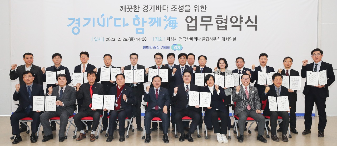 오병권 경기도 행정1부지사와 화성·안산·평택·시흥·김포시 등 연안 5개 시 부시장, 경기주택도시공사 등 경기도 산하 11개 공공기관장은 28일 오후 화성시 전곡항마리나 클럽하우스에서 이런 내용을 담은 ‘경기바다 함께해(海) 추진 업무협약’을 체결했다.