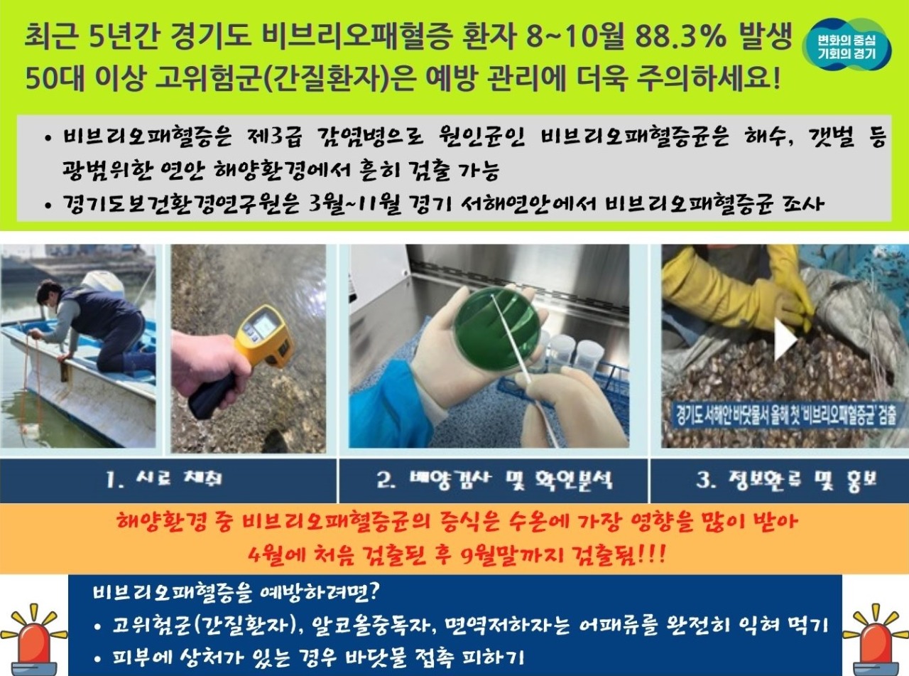 연구원은 매년 비브리오패혈증 사전 예방을 위해 김포, 시흥, 안산, 화성, 평택 등 5개 지역에서 해수‧갯벌에서 비브리오패혈증 사전 예방을 위한 감시사업을 진행하고 있다.