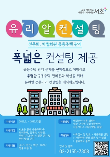 '공동주택관리 전문가 자문단' 및 '유리알 컨설팅'의 자문 비용은 구에서 지원한다. 자문을 원하는 공동주택은 신청서, 사업계획서, 도면, 견적서 등 필요서류를 구비해 '서초구 공동주택&재건축 정보포털'에 신청하면 된다.