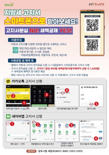 경기 양주시는 스마트폰으로 간편하게 지방세 고지서를 받고 납부 할 수 있는 '지방세 전자송달 서비스'를 적극 홍보에 나섰다.