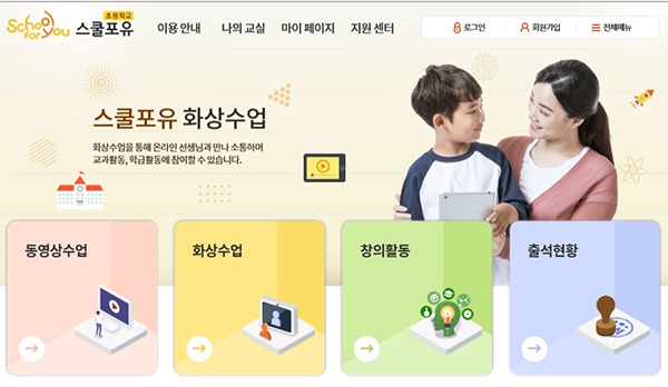 이번에 새로 개설한 ‘스쿨포유 초등과정’은 PC와 모바일, 태블릿PC 등을 활용해 언제 어디서나 쉽게 접근이 가능하다. 또 학생들은 화상과 동영상 수업에 참여해 출석을 인정받고, 학급게시판과 쪽지함 등에서 교과별 질의응답 및 상담 기능을 이용할 수 있다.