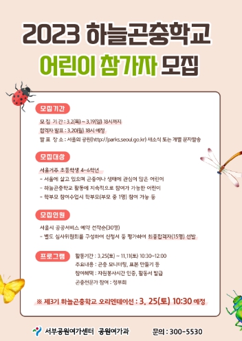 하늘곤충학교는 서울거주 초등학생 4~6학년 누구든지 신청이 가능하며 3월 2일부터 3월 19일까지 서울시공공서비스예약을 통해 사전 예약 후, 담당자 이메일로 제출하면 된다.