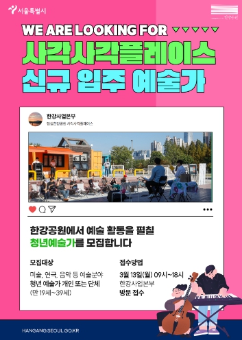 ‘사각사각 플레이스’에서 함께하고 싶은 예술가는 3월 13일, 9시~18시에 서울특별시 한강사업본부(성동구 강변북로 257)에 방문하여 서류를 제출하면 된다.