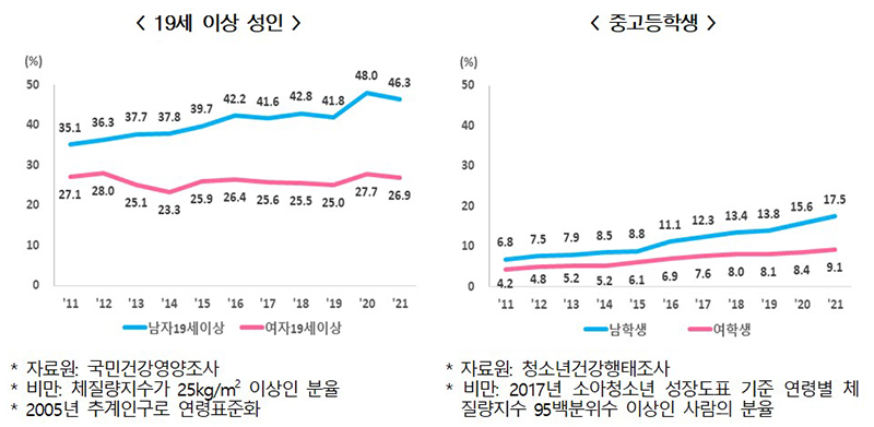 2011년에서 2021년까지 최근 10년 동안 우리나라 성인과 중·고등학생 모두 비만 유병률이 증가한 것으로 나타났다.