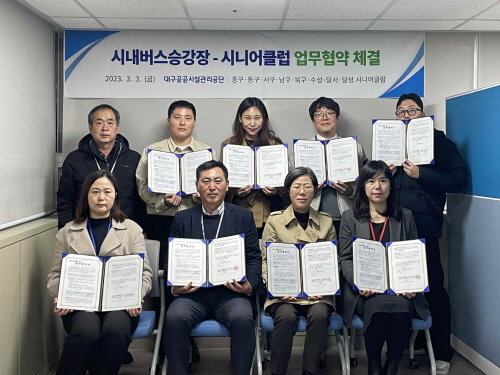 대구공공시설관리공단은 이달 3일 버스 승강장 환경정화 활동 및 어르신 일자리 창출을 위해 대구시 7개 구·군 시니어클럽과 '2023년 버스승강장 도우미사업 업무협약'을 체결했다.