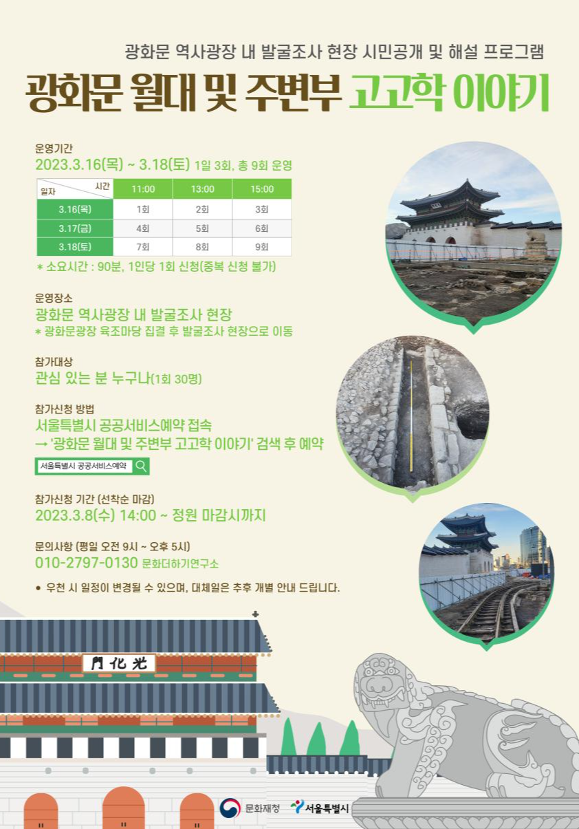참가 신청은 서울시 공공서비스 예약 누리집에서 ‘광화문 월대 및 주변부 고고학 이야기’를 검색한 후 예약하면 된다. 우천 시에는 행사 일정이 변경될 수 있다.